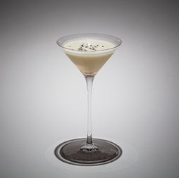 サトウキビを原料にした蒸溜酒「カシャーサ」と「柿リキュール」をベースにソーダアップした下層に「キーライム」を燕子花の葉に見立てて浮かべ、「ツェラー・シュバルツェ・カッツ」という黒猫のラベルで有名な白ワインと「バタフライピー」というハーブテイー、ハーブの「タイム」から作った美しい青紫色の液体を浮かべ、その色あいから『燕子花』を表現しました。その上に、光琳の金屏風をイメージして金箔を散りばめています。